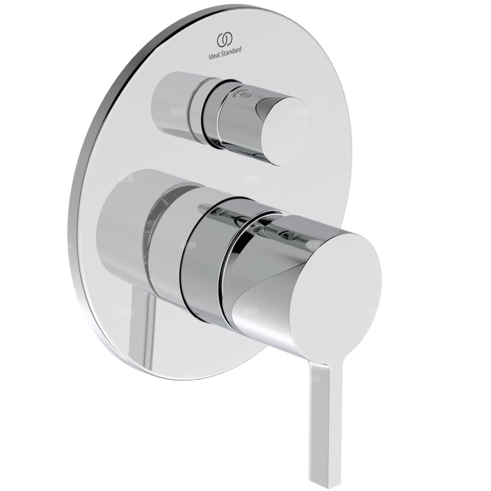 Zestaw montażowy (widoczna część). Głowica 47 mm CLICK z ogranicznikiem temperatury. Cylindryczna metalowa rozeta z logo Ideal Standard. Metalowy uchwyt bez oznaczeń. Automatyczny przełącznik. Do skompletowania z uniwersalnym zestawem podtynkowym EASY-BOX A1000NU.