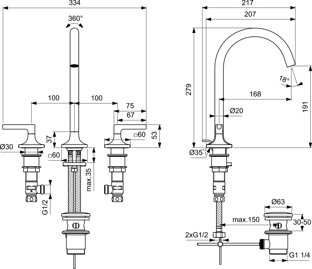 Bateria umywalkowa 3-otworowa, metalowy korek automatyczny.