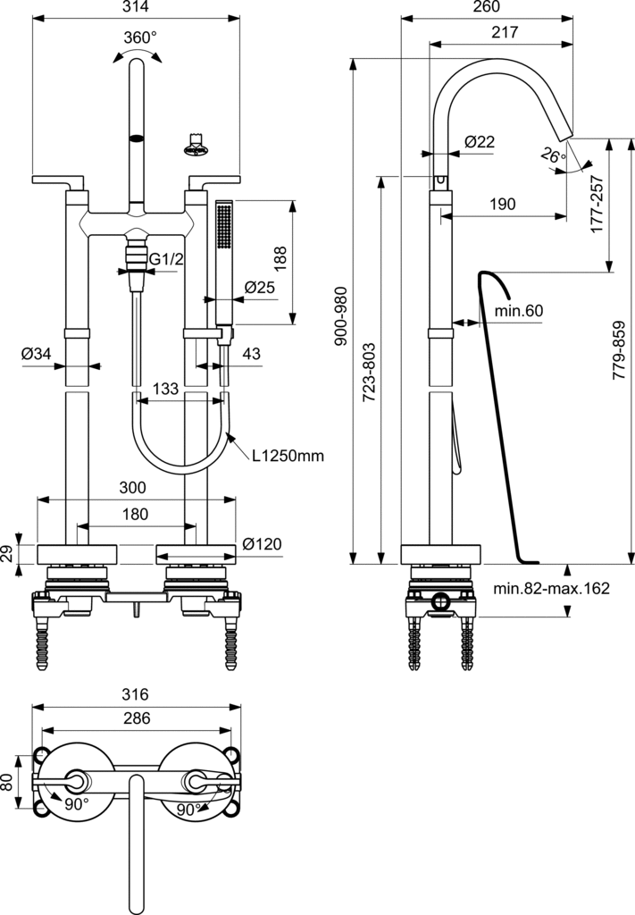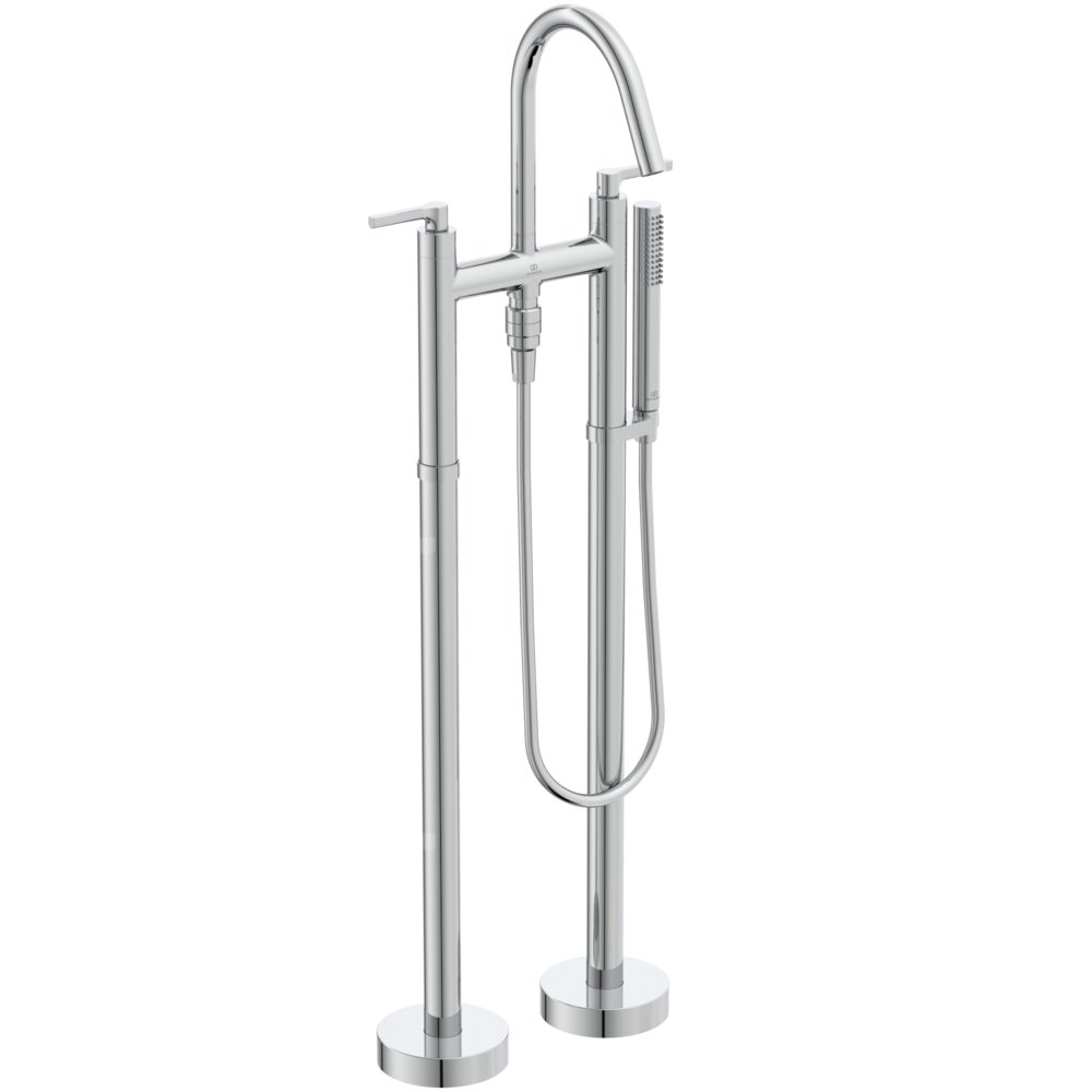Bateria natryskowo-wannowa wolnostojąca, uchwyty dźwigniowe.