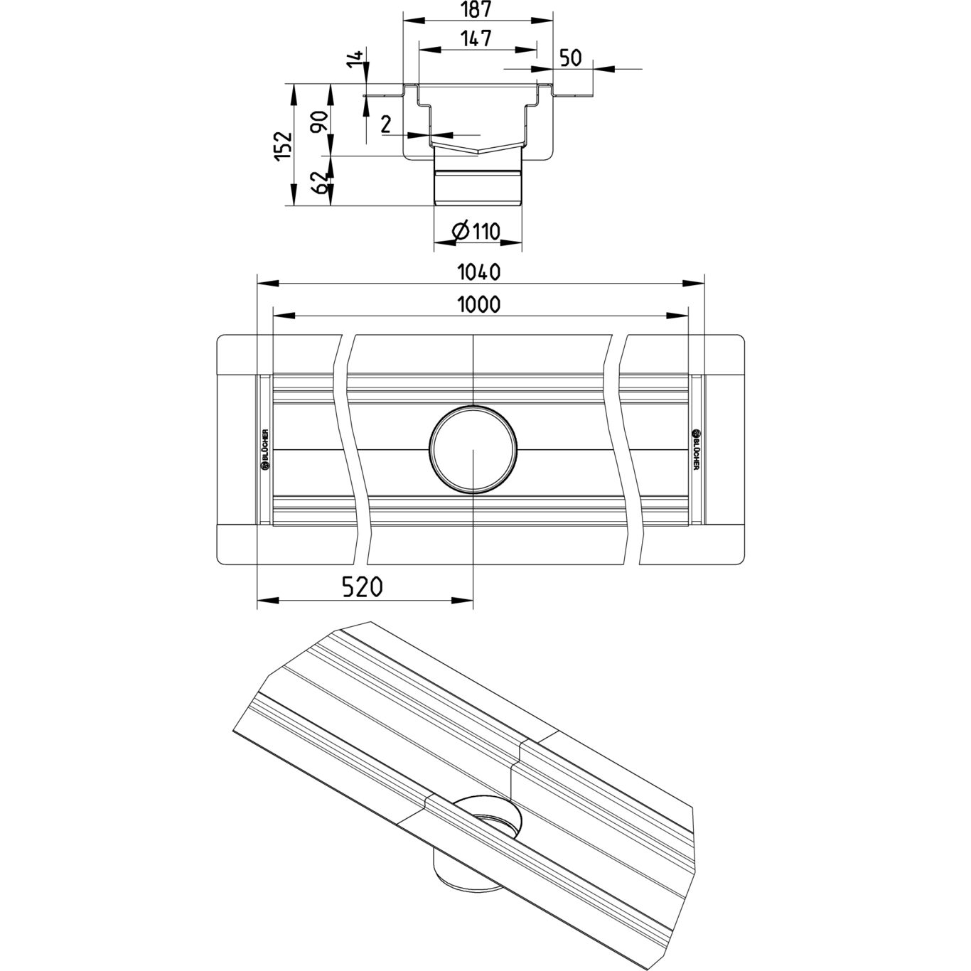 Kanał 150x1000 z odpływem na środku kanału DN 110, z kołnierzem do izolacji wylewanej, wymiar wewn. 187x1040 mm