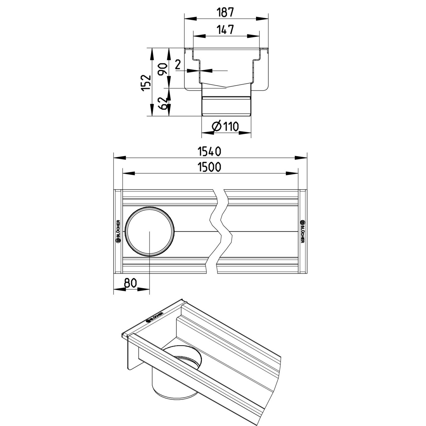 Kanał 150x1500 odpływ na końcu DN 110 wymiar zewn. 187mm x1540 mm