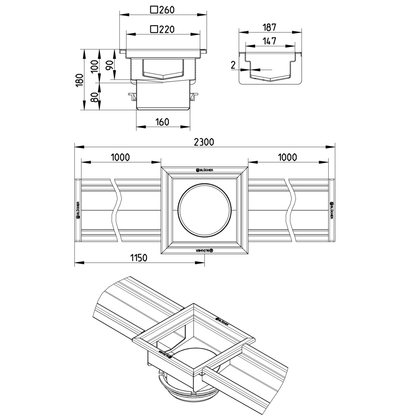 Kanał 150x2000 ze skrzynką wlotową 220x220 na środku odpływ DN 160, wymiar zewn. 187mm x2300 mm