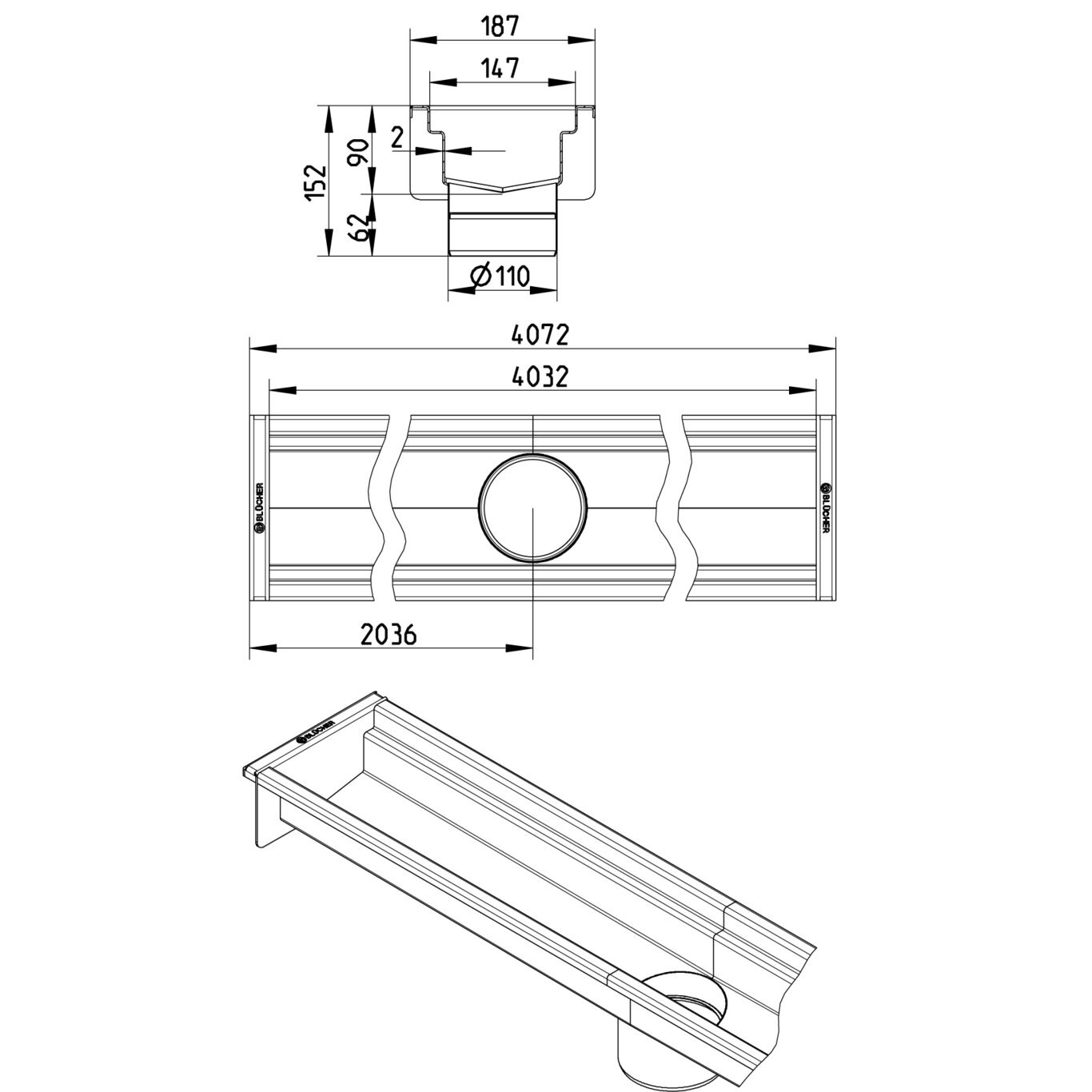 Kanał 150x4000 odpływ na środku DN 110 wymiar zewn. 187mm x4072 mm