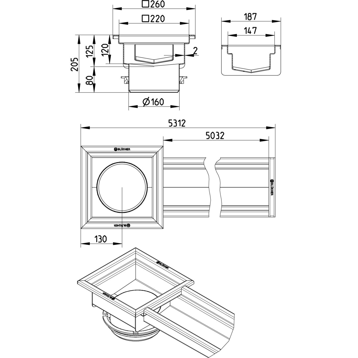 Kanał 150x5000 ze skrzynką wlotową 220x220 na końcu odpływ DN 160, wymiar zewn. 187mm x5312 mm