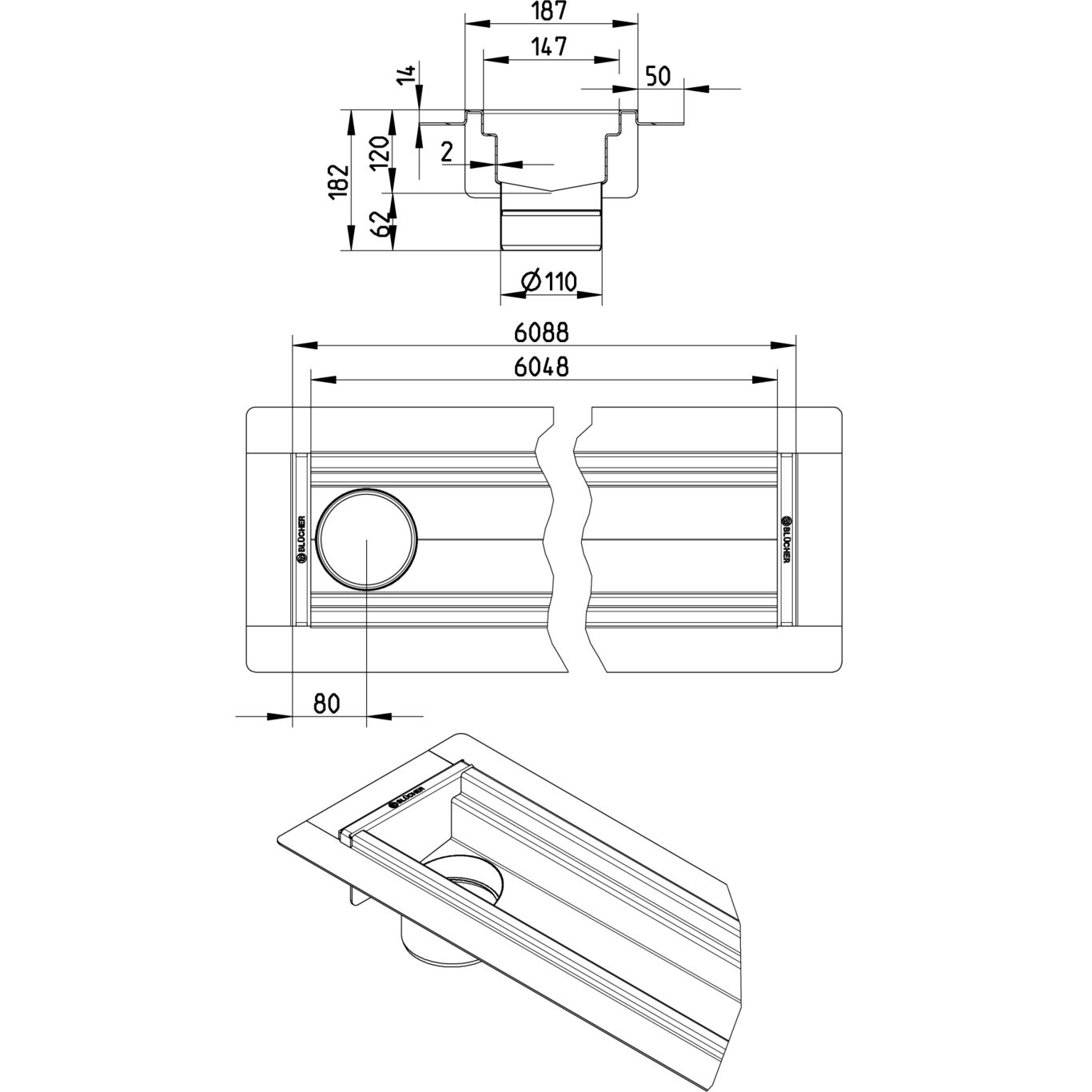 Kanał 150x6000 z odpływem na końcu kanału DN 110, z kołnierzem do izolacji wylewanej, wymiar wewn. 187x6088 mm