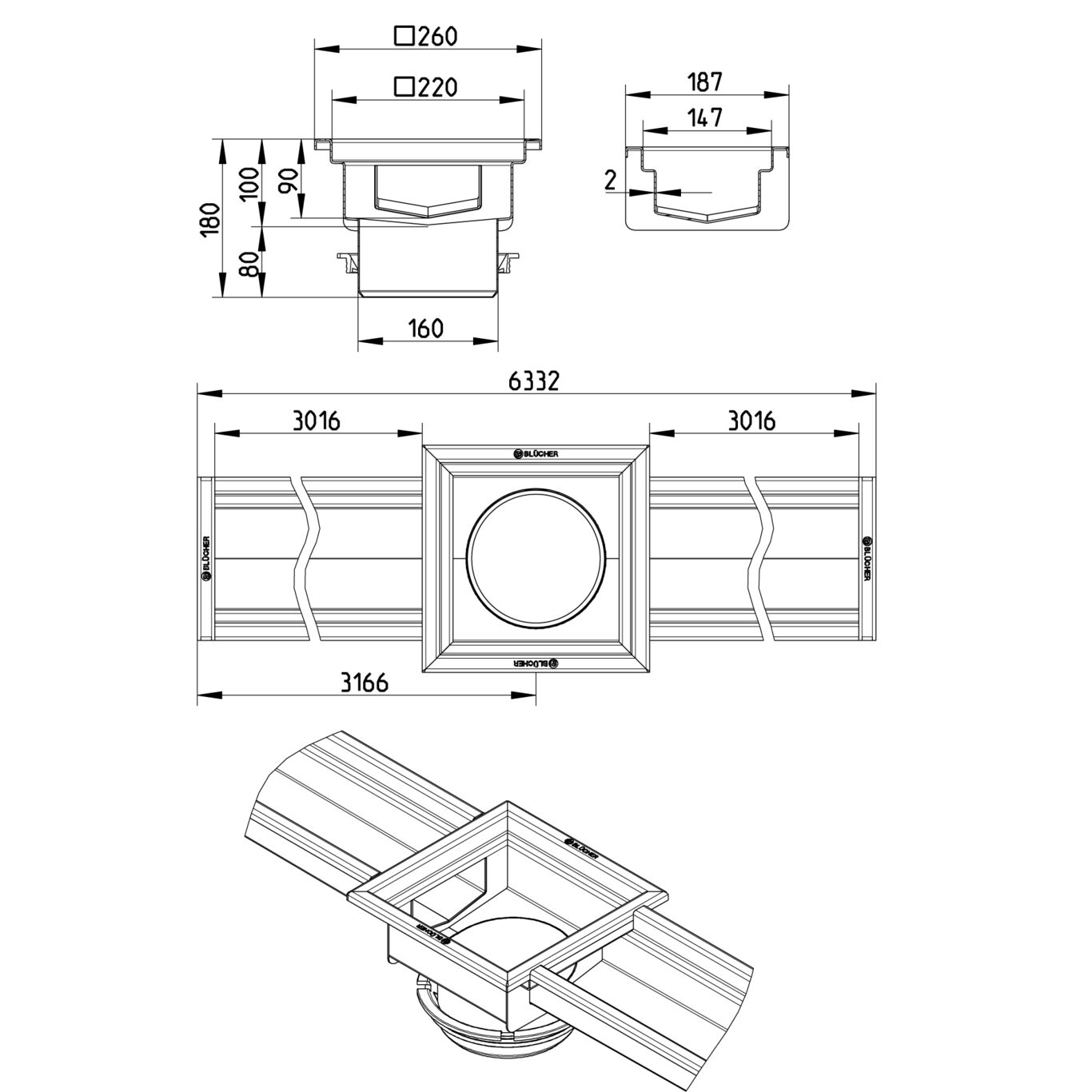 Kanał 150x6000 ze skrzynką wlotową 220x220 na środku odpływ DN 160, wymiar zewn. 187mm x 6332 mm