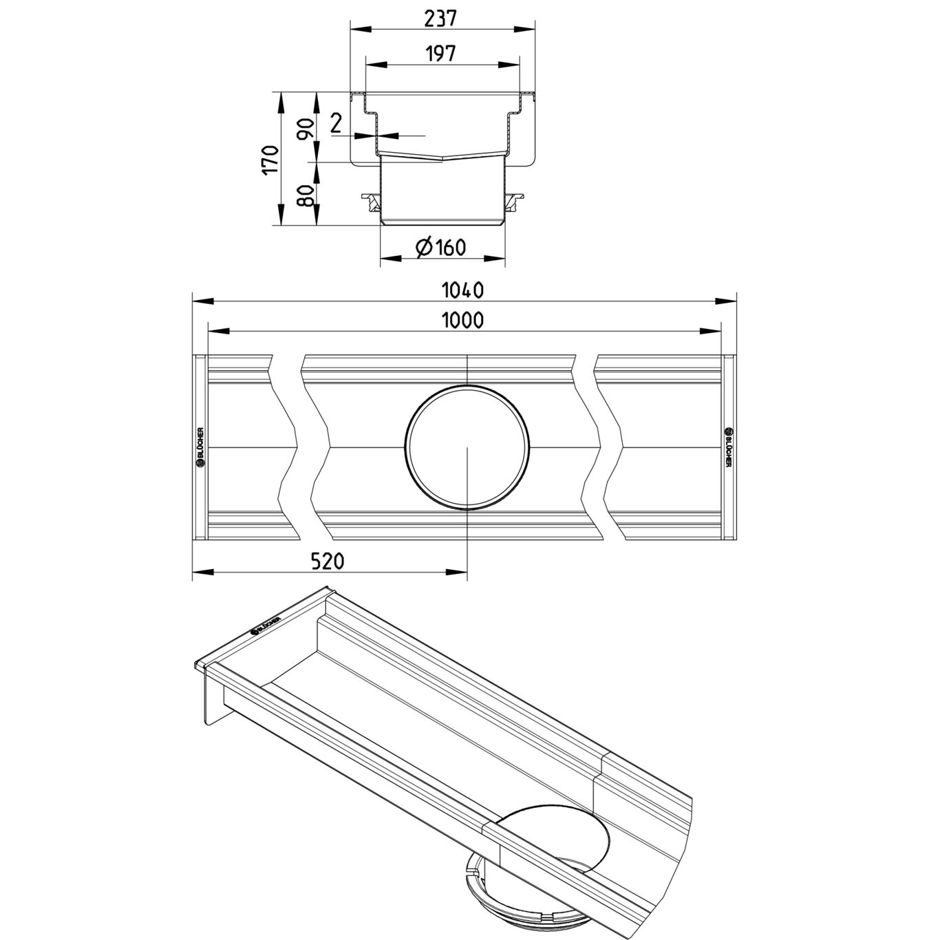 Kanał 200x1000 odpływ na środku DN 160 wymiar zewn. 237mm x1040 mm