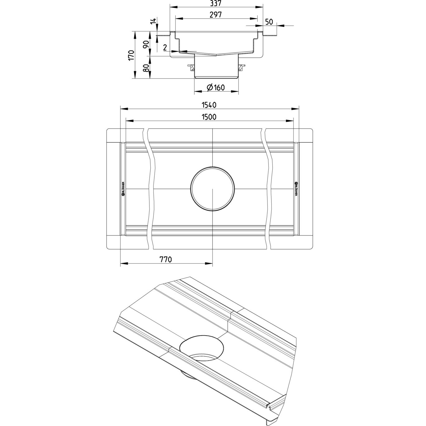 Kanał 200x1500 z odpływem na środku kanału DN 160, z kołnierzem do izolacji wylewanej, wymiar wewn. 337x1540 mm