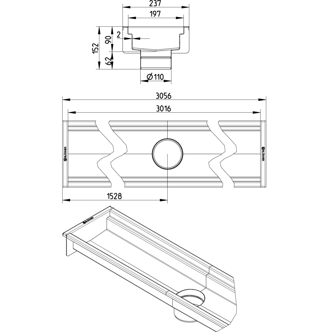 Kanał 200x3000 odpływ na środku DN 110 wymiar zewn. 237mm x3056 mm