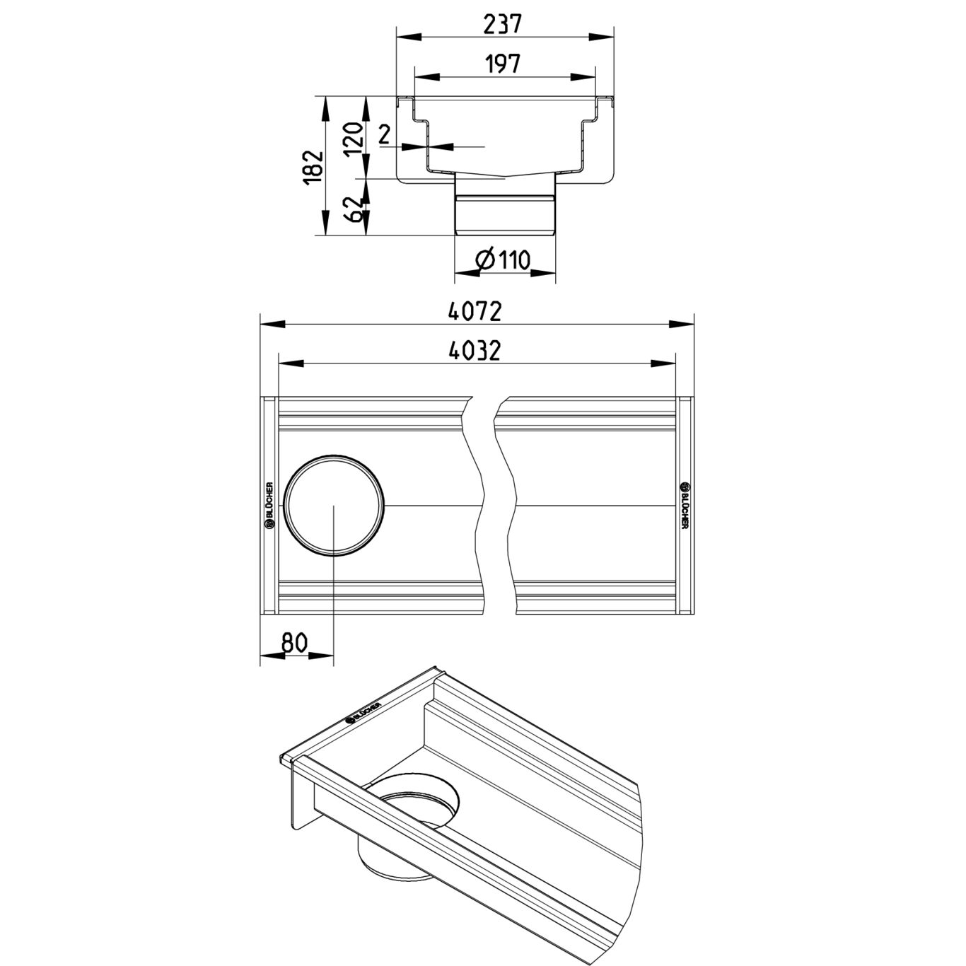 Kanał 200x4000 odpływ na końcu DN 110 wymiar zewn. 237mm x4072 mm