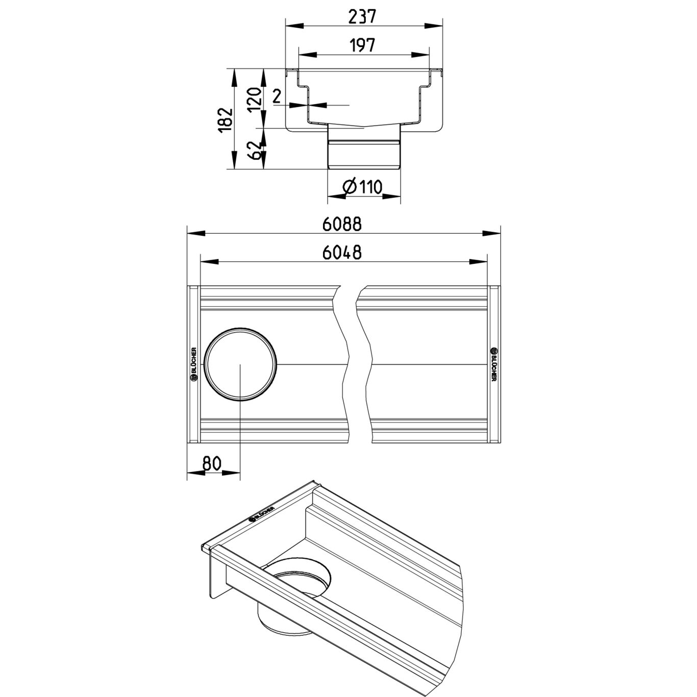 Kanał 200x6000 odpływ na końcu DN 110 wymiar zewn. 237mm x6088 mm