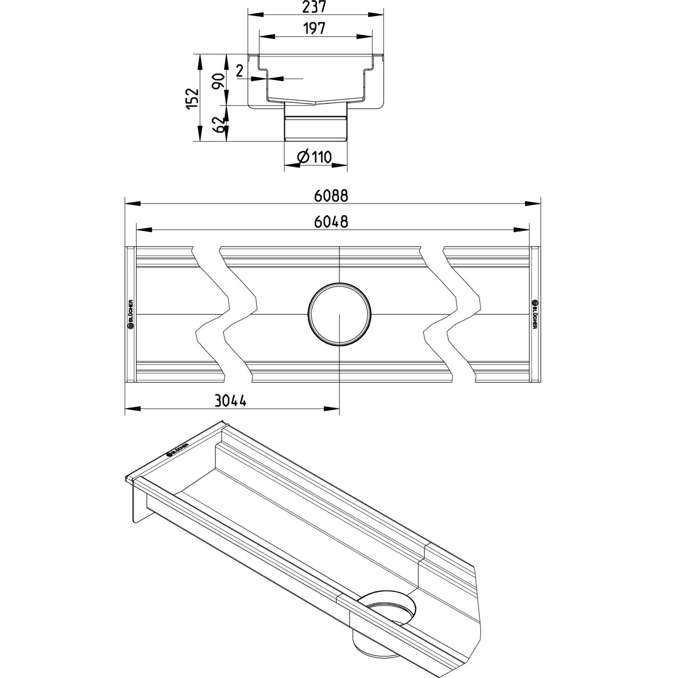Kanał 200x6000 odpływ na środku DN 110 wymiar zewn. 237mm x6088 mm
