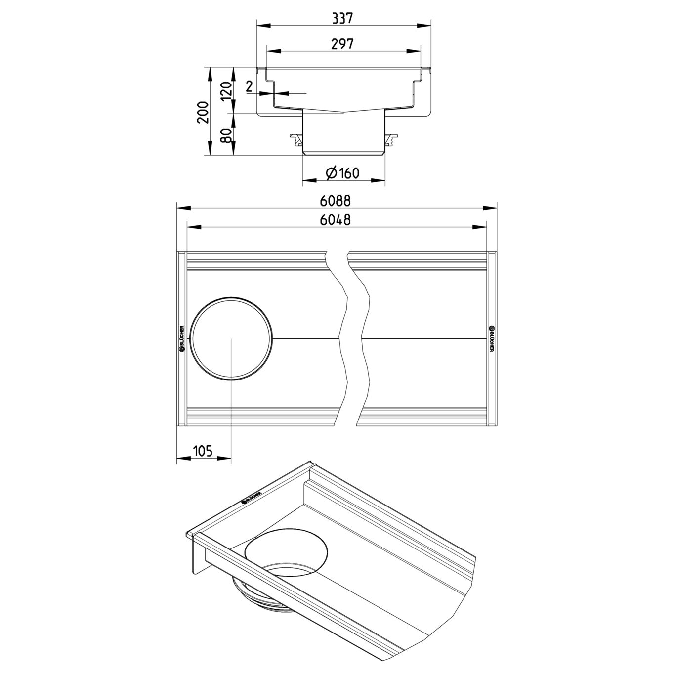 Kanał 300x6000 odpływ na końcu DN 160 wymiar zewn. 337mm x6088 mm