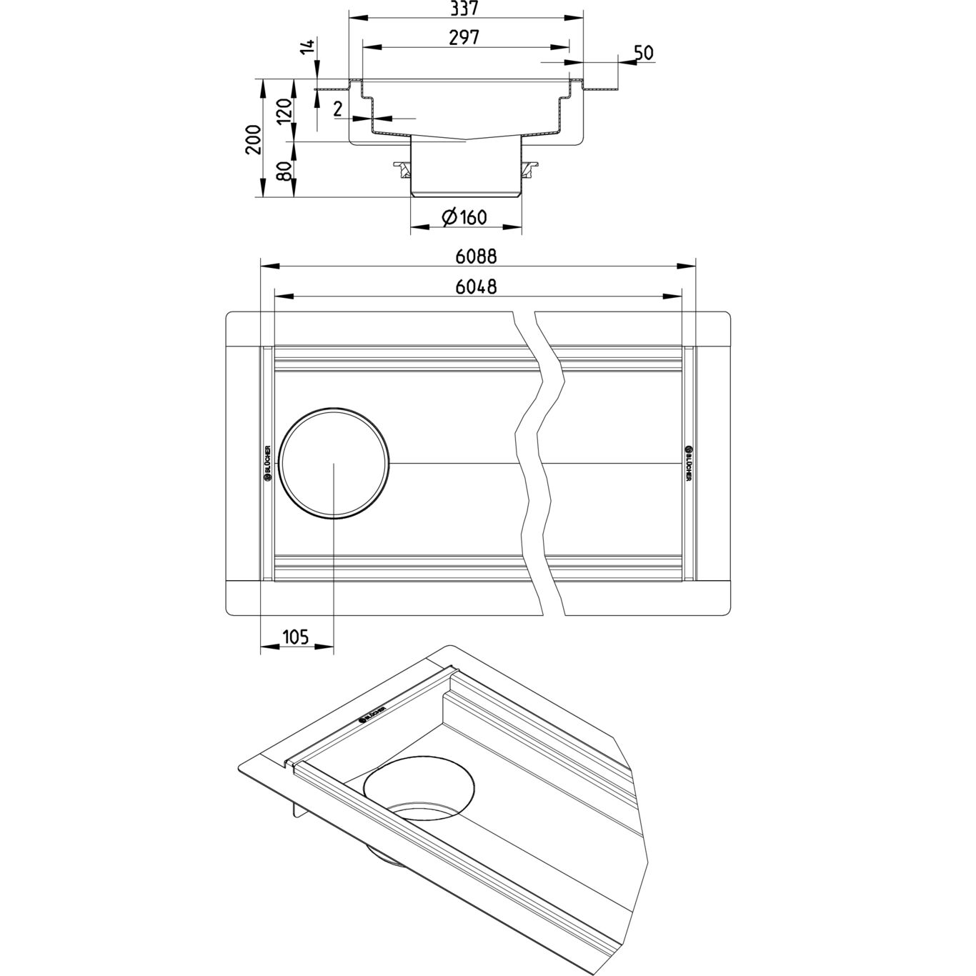 Kanał 300x6000 z odpływem na końcu kanału DN 160, z kołnierzem do 337x6088 mm