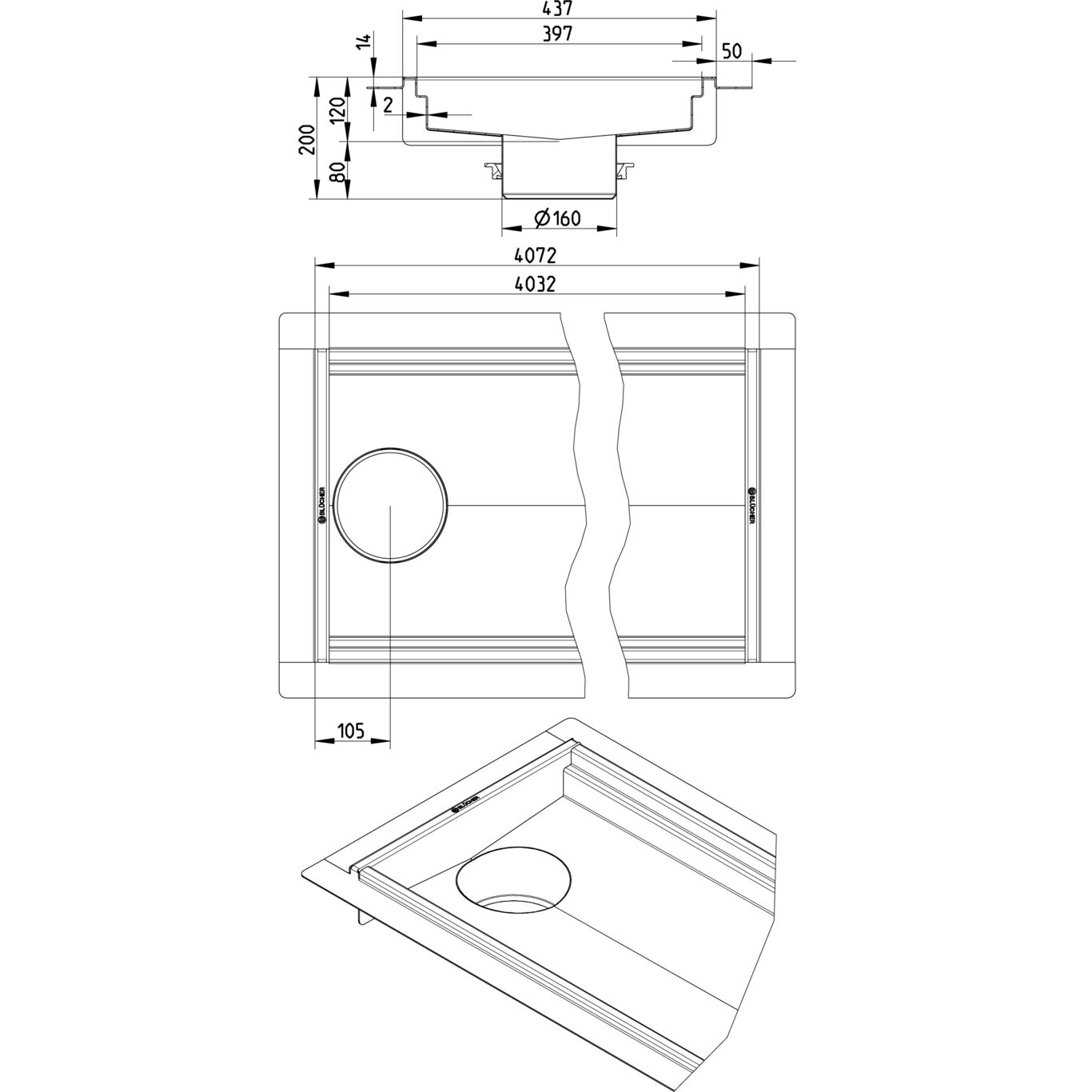 Kanał 400x4000 z odpływem na końcu kanału DN 160, z kołnierzem do izolacji wylewanej, wymiar wewn. 437x4072 mm