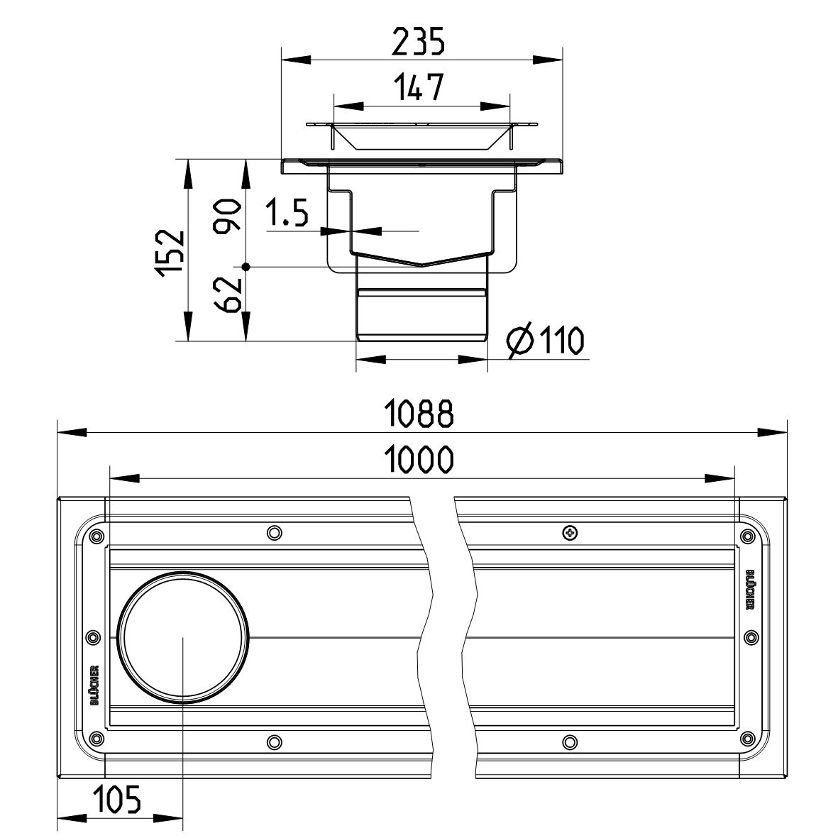 Kanał do winylu 150x1000, z odpływem na końcu odpływ DN 110, wymiar zewn. 235 mm x 1088 mm