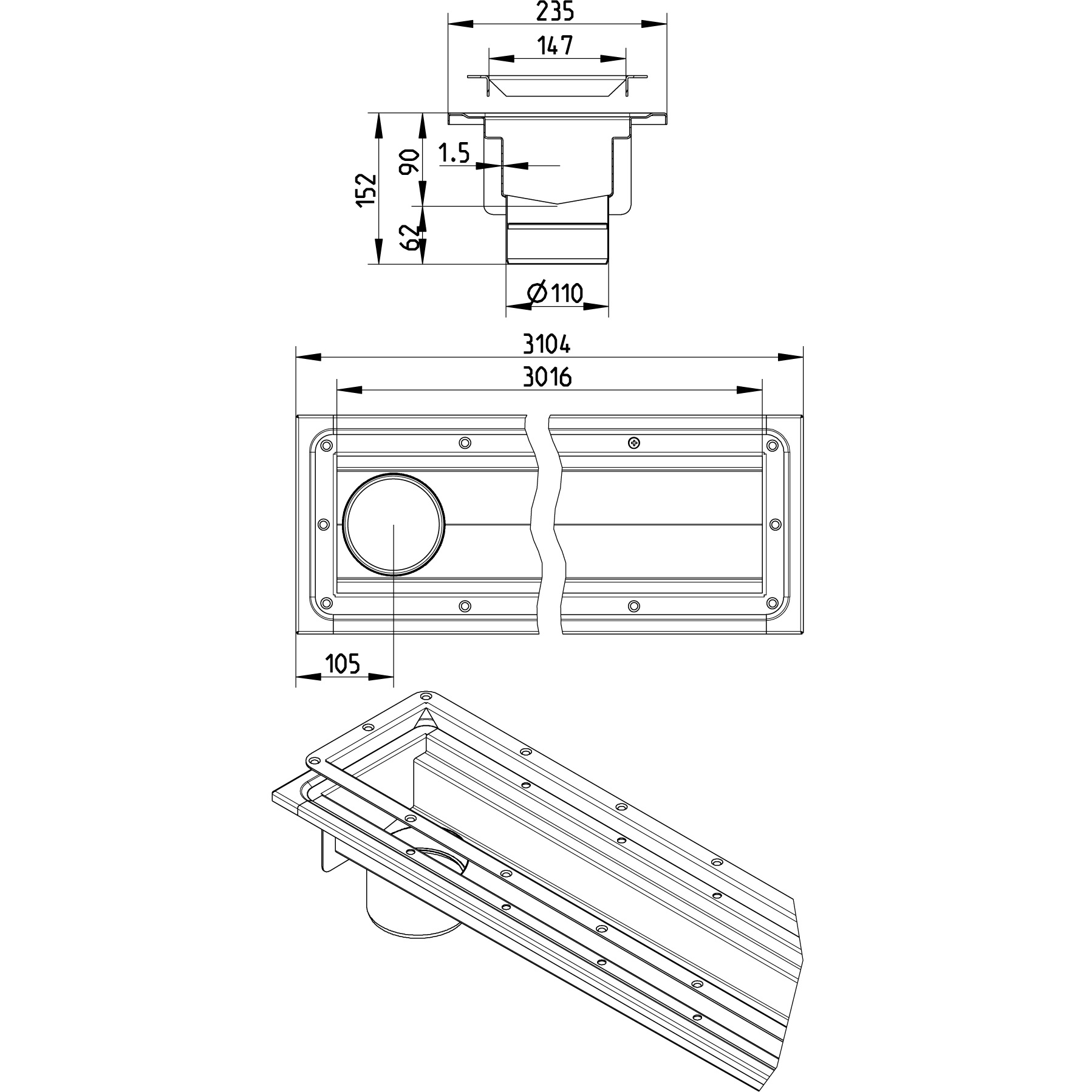 Kanał do winylu 150x4000, z odpływem na końcu odpływ DN 110, wymiar zewn. 235 mm x 4120 mm, stal kwasoodporna