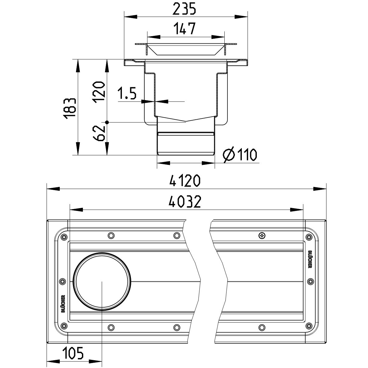 Kanał do winylu 150x4000, z odpływem na końcu odpływ DN 110, wymiar zewn. 235 mm x 4120 mm