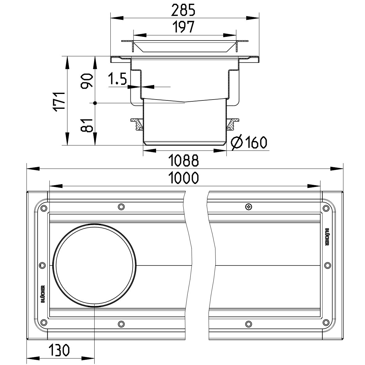Kanał do winylu 200x1000, z odpływem na końcu odpływ DN 160, wymiar zewn. 285 mm x 1088 mm