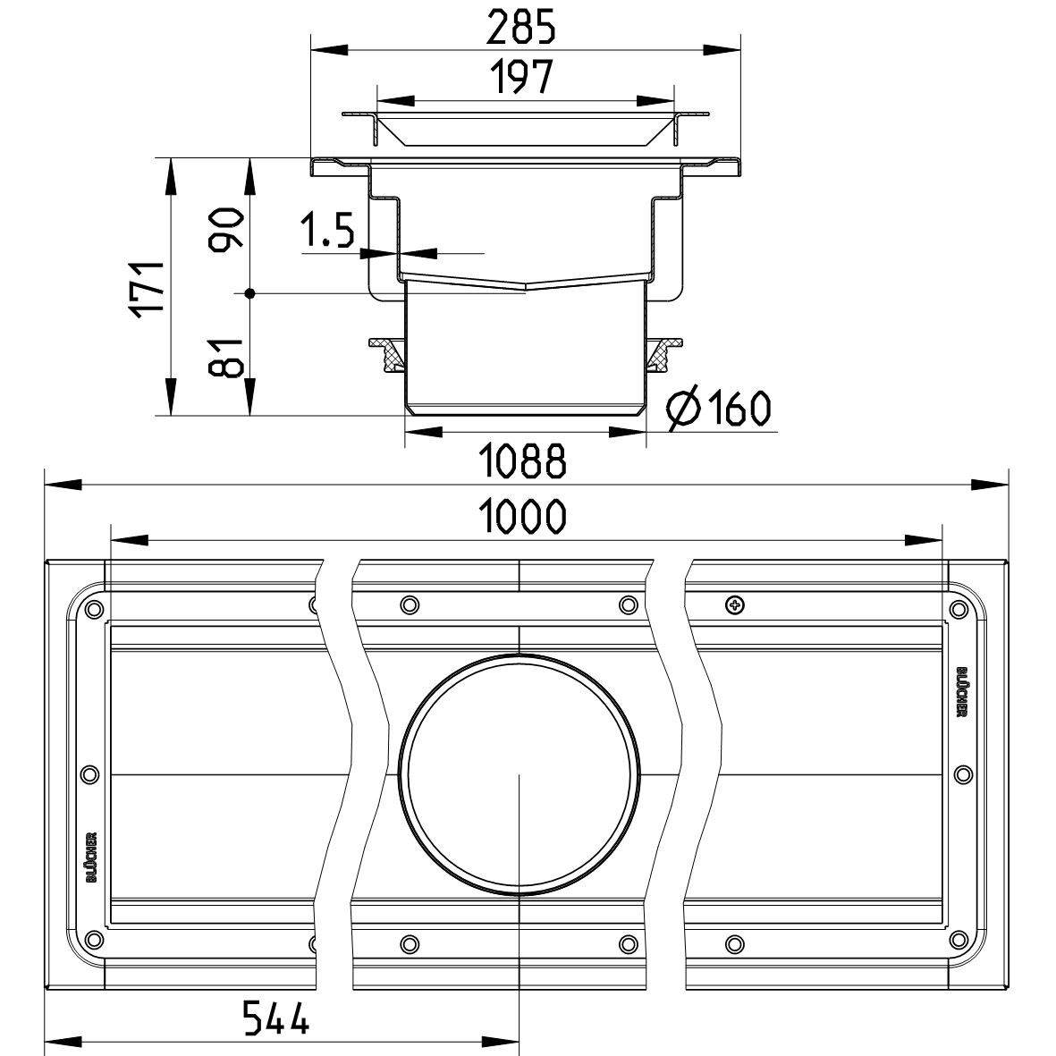Kanał do winylu 200x1000, z odpływem na środku odpływ DN 160, wymiar zewn. 285 mm x 1088 mm