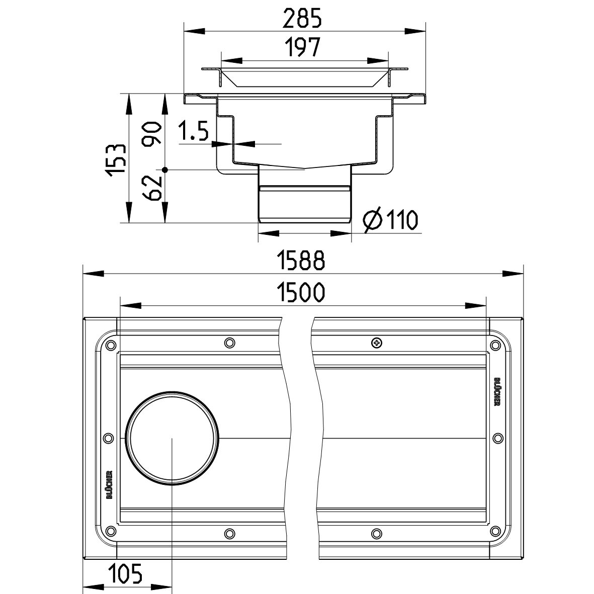 Kanał do winylu 200x1500, z odpływem na końcu odpływ DN 110, wymiar zewn. 285 mm x 1588 mm