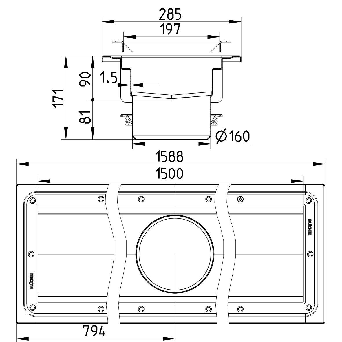 Kanał do winylu 200x1500, z odpływem na środku odpływ DN 160, wymiar zewn. 285 mm x 1588 mm