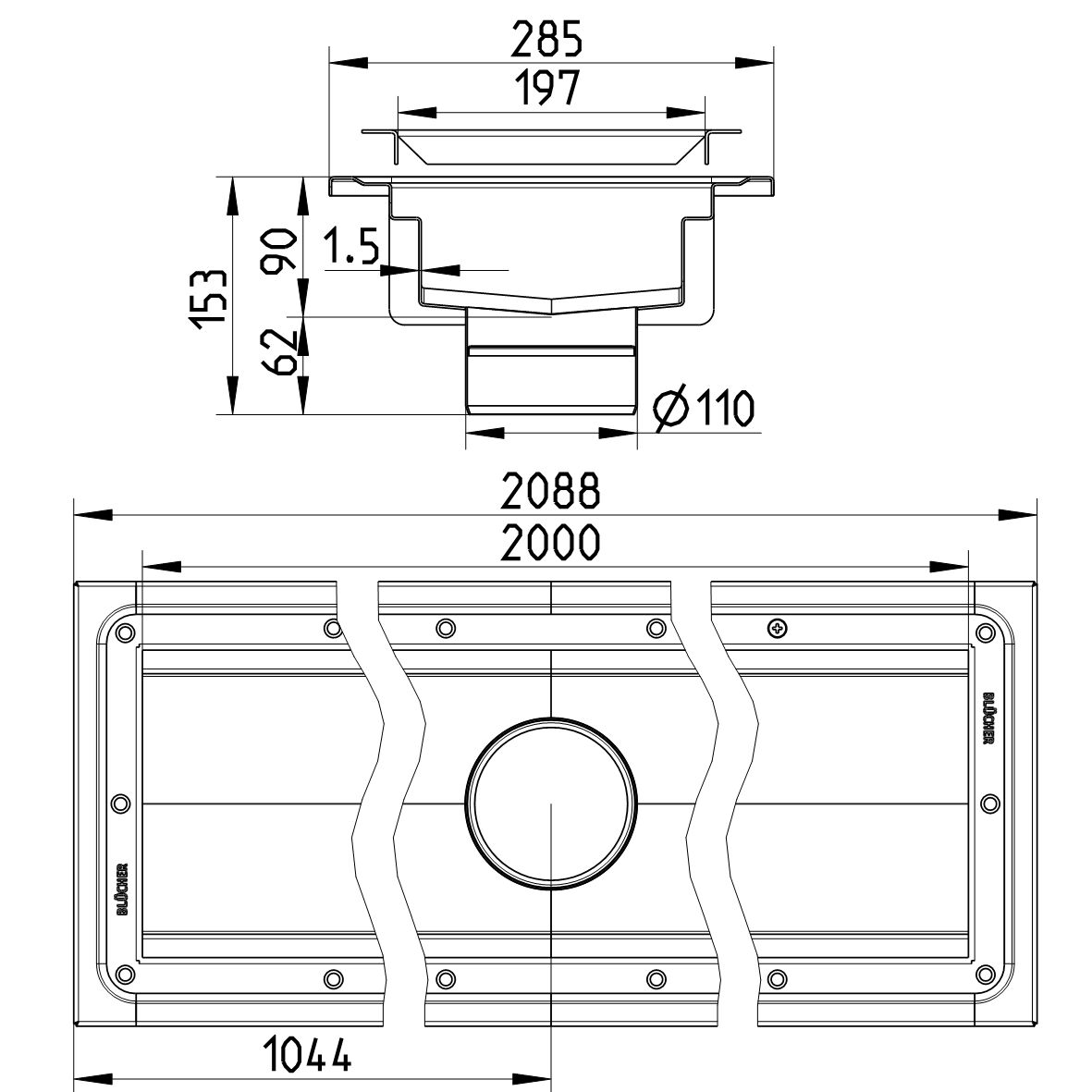 Kanał do winylu 200x2000, z odpływem na środku odpływ DN 110, wymiar zewn. 285 mm x 2088 mm