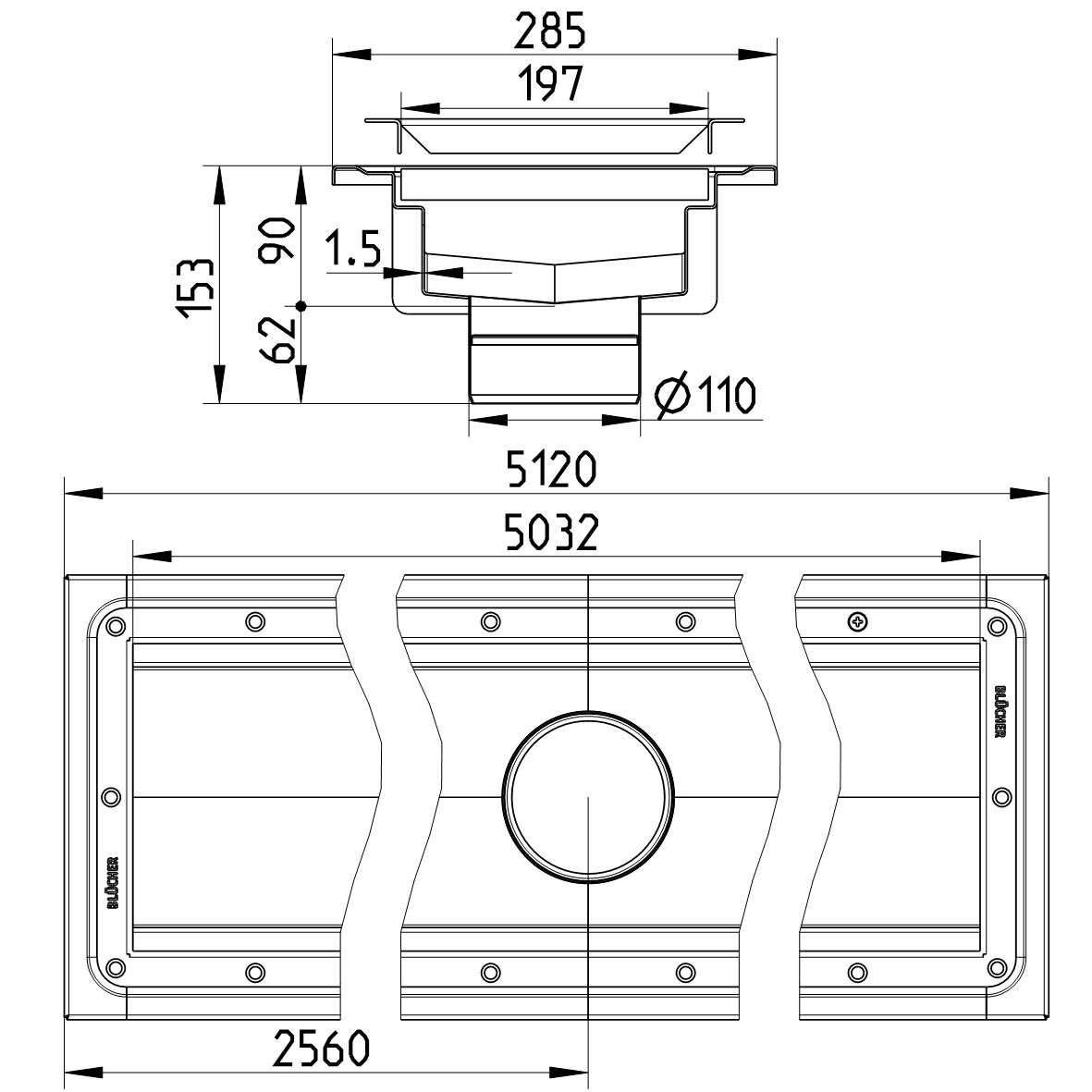 Kanał do winylu 200x5000, z odpływem na środku odpływ DN 110, wymiar zewn. 285 mm x 5120 mm
