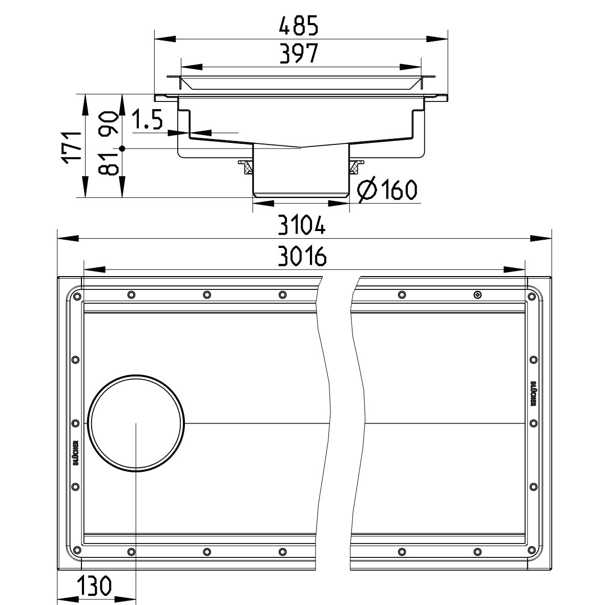 Kanał do winylu 400x3000, z odpływem na końcu odpływ DN 160, wymiar zewn. 485 mm x 3104 mm