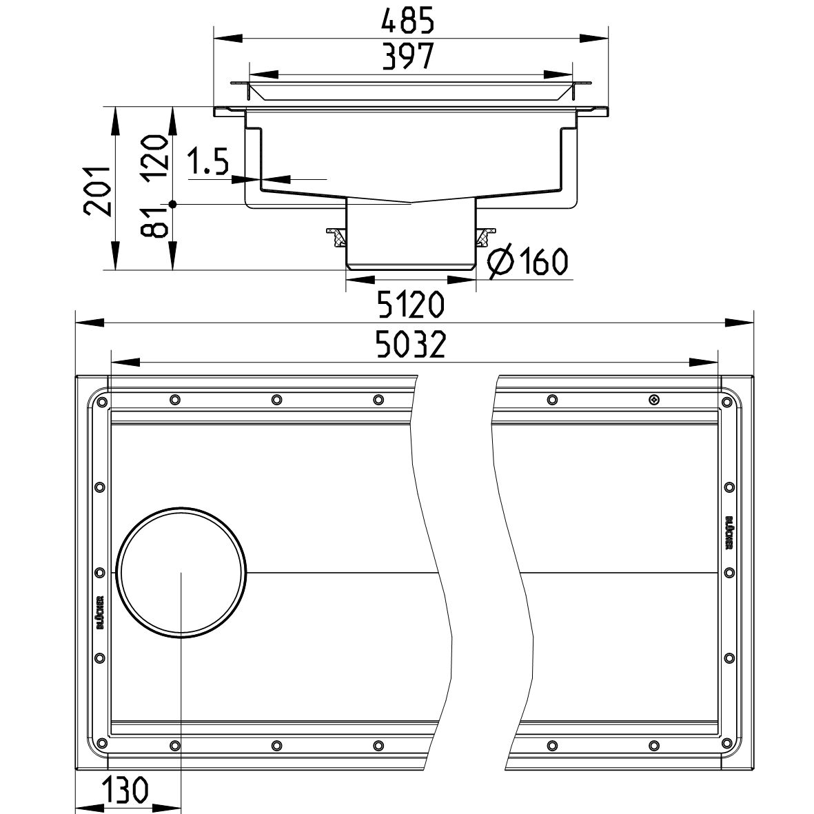 Kanał do winylu 400x5000, z odpływem na końcu odpływ DN 160, wymiar zewn. 485 mm x 5120 mm