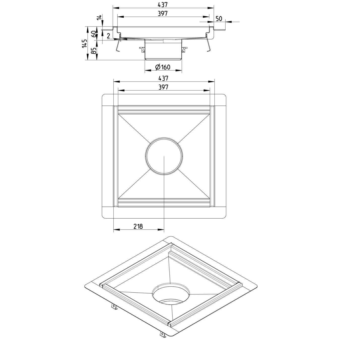 Kanał kuchenny 400x400 odpływ DN 160, z kołnierzem do podłóg z izolacją wylewaną, wys. wewn. 60 mm
