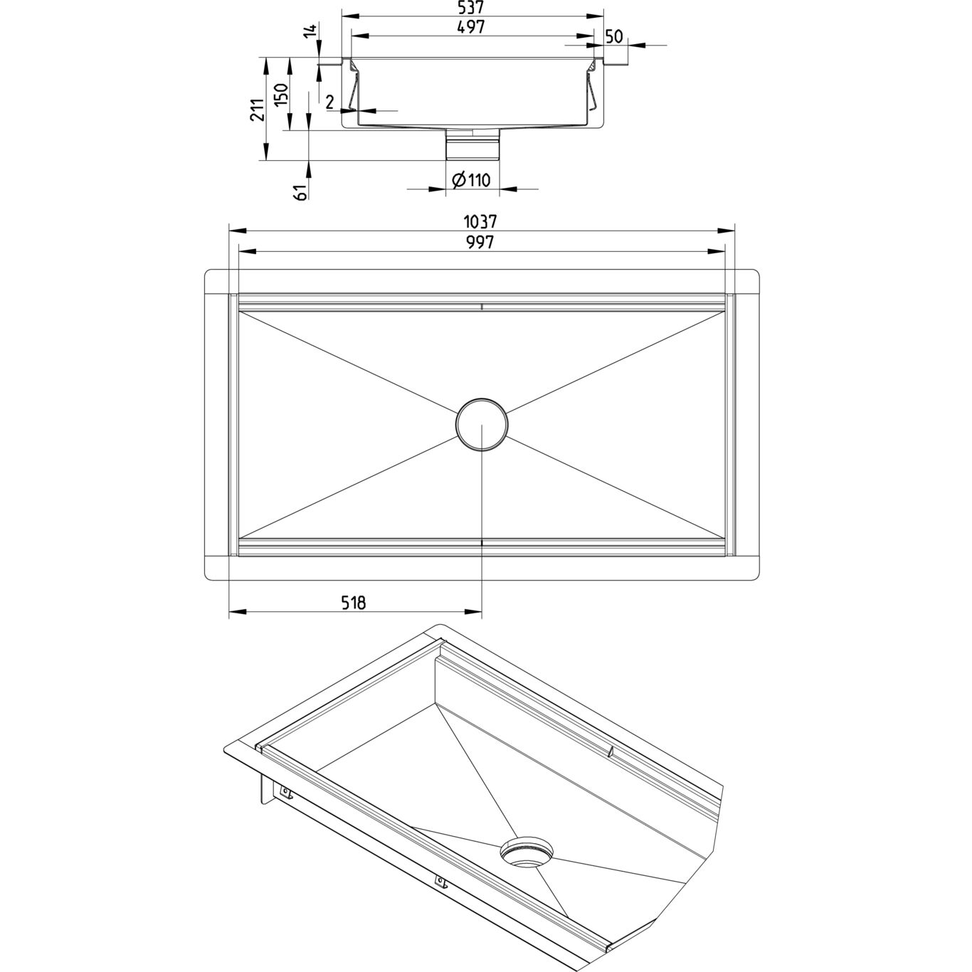 Kanał kuchenny 500x1000 odpływ DN 110, z kołnierzem do podłóg z izolacją wylewaną, wys. wewn. 150 mm