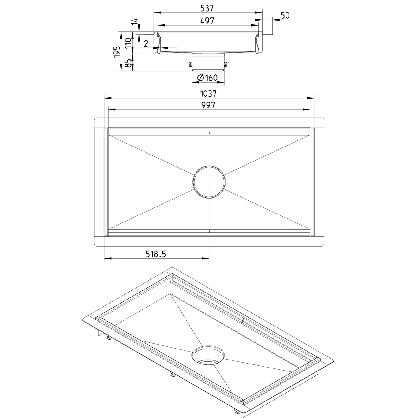 Kanał kuchenny 500x1000 odpływ DN 160, z kołnierzem do podłóg z izolacją wylewaną, wys. wewn. 110 mm