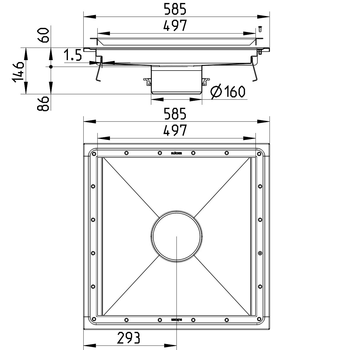 Kanał kuchenny do winylu 500x500 odpływ DN 160, wys. wewn. 60 mm