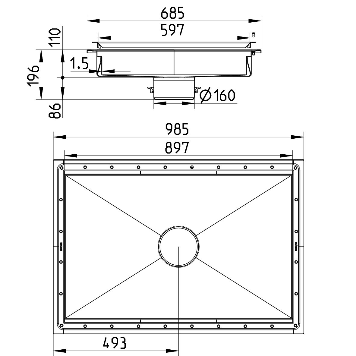 Kanał kuchenny do winylu 500x900 odpływ DN 160, wys. wewn. 110 mm