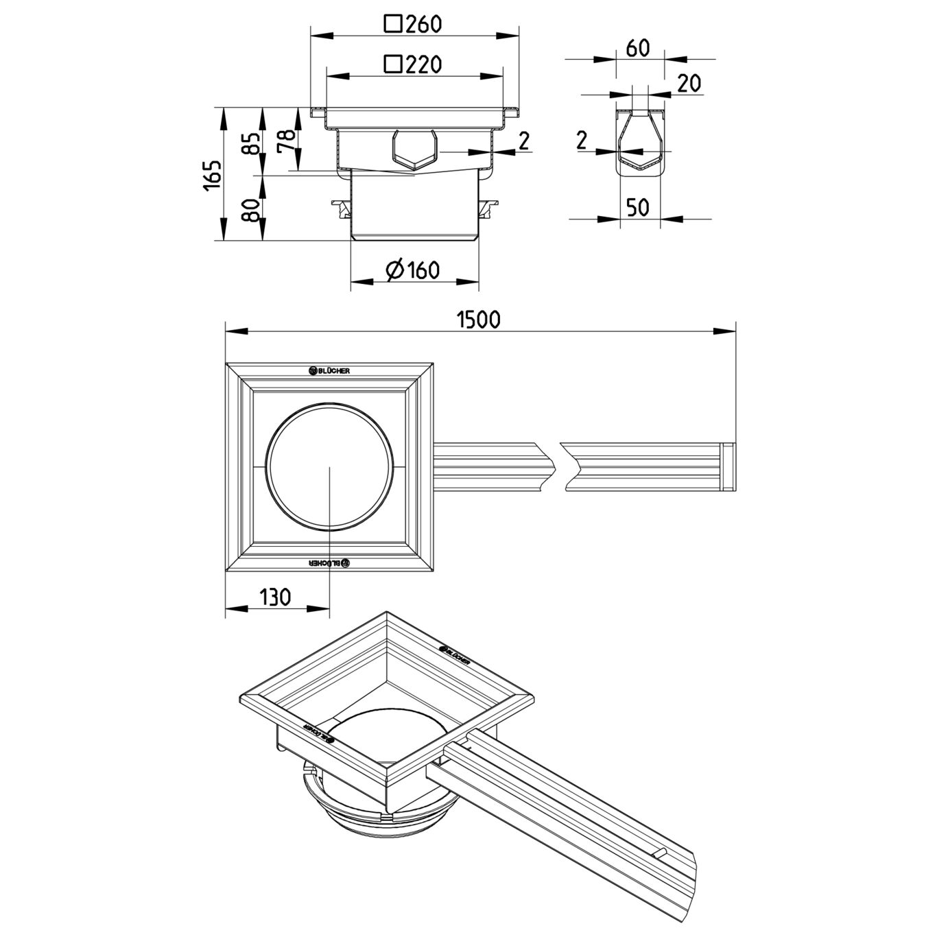 Kanał szczelinowy 20x1500, ze skrzynką wlotową 220x200 na końcu, odpływ DN 160