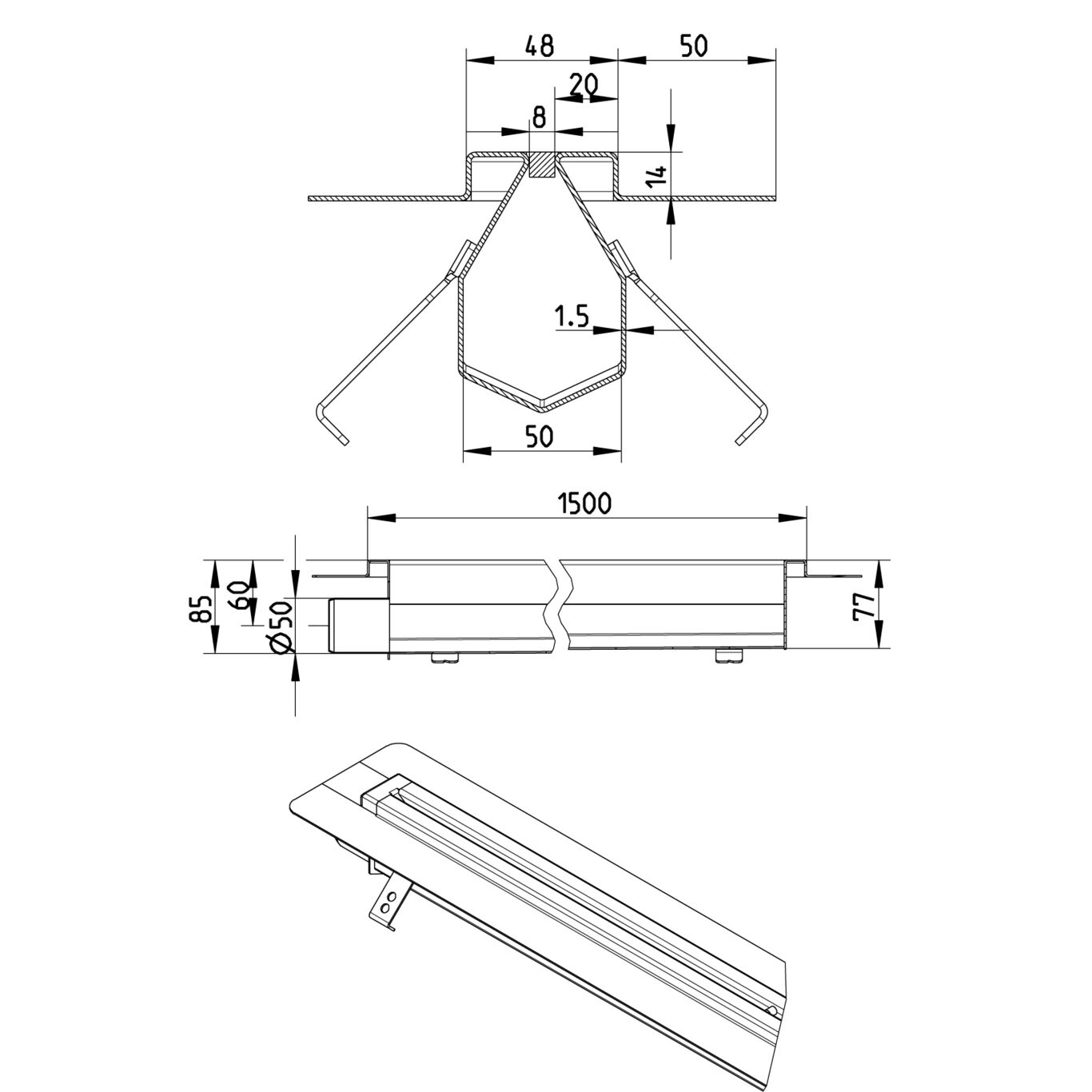 Kanał szczelinowy 8x1500, odpływ na końcu DN 50 mm, z kołnierzem do izolacji