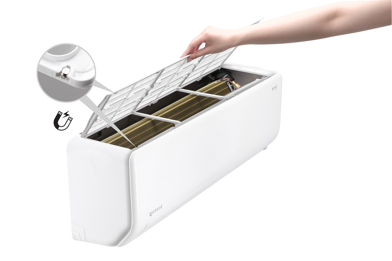 Revio wyróżnia niespotykana dotąd prostota montażu jednostki wewnętrznej, która posiada tylko jedną śrubę i 4 klamry. Umożliwia to, w 1 minutę pełny demontaż jednostki podczas okresowych serwisów. Również wyjątkowy prosty jest dostęp do filtrów w klimatyzatorze, dzięki górnej pokrywie klimatyzatora nowatorsko mocowanej na magnesy.