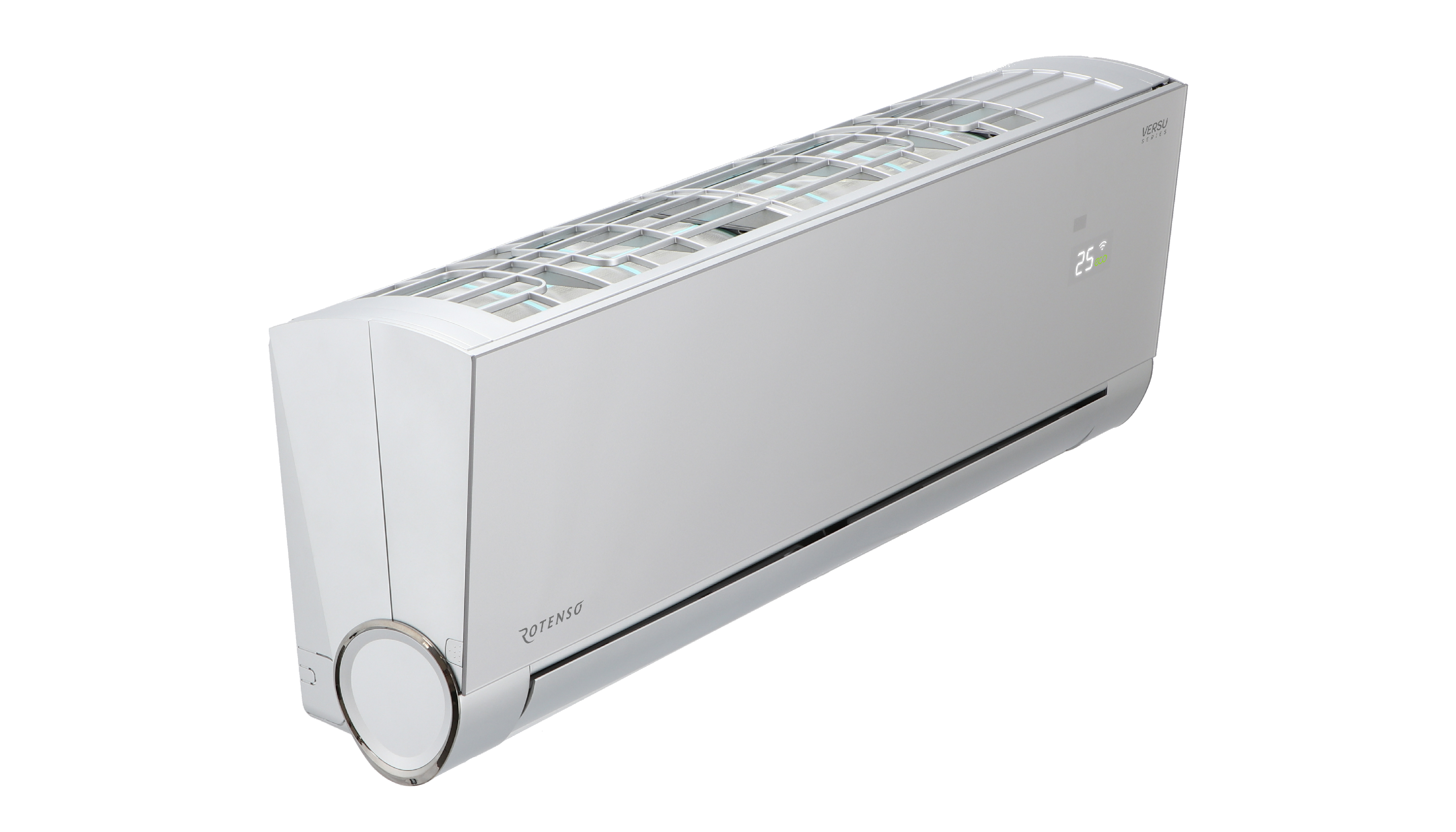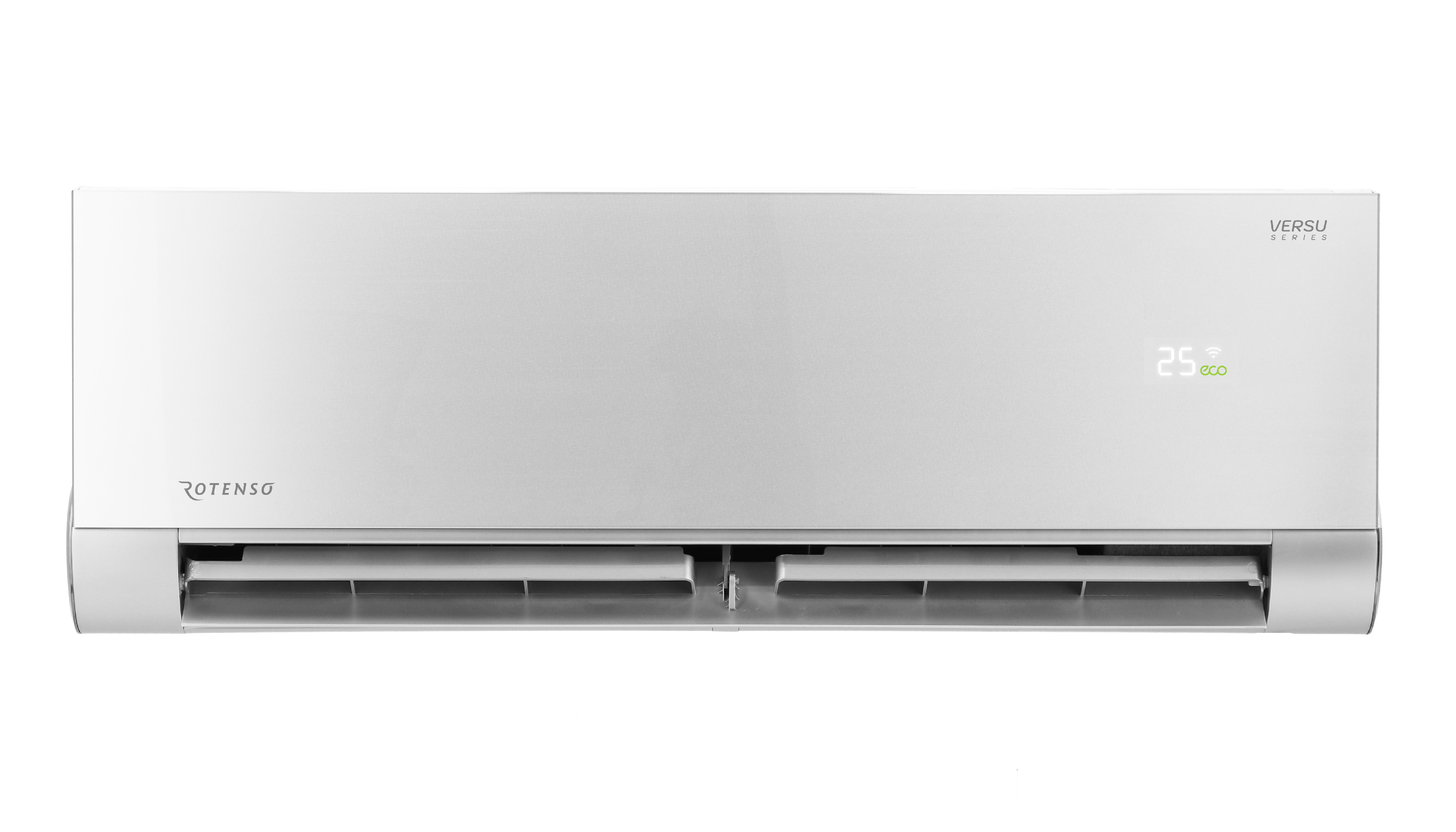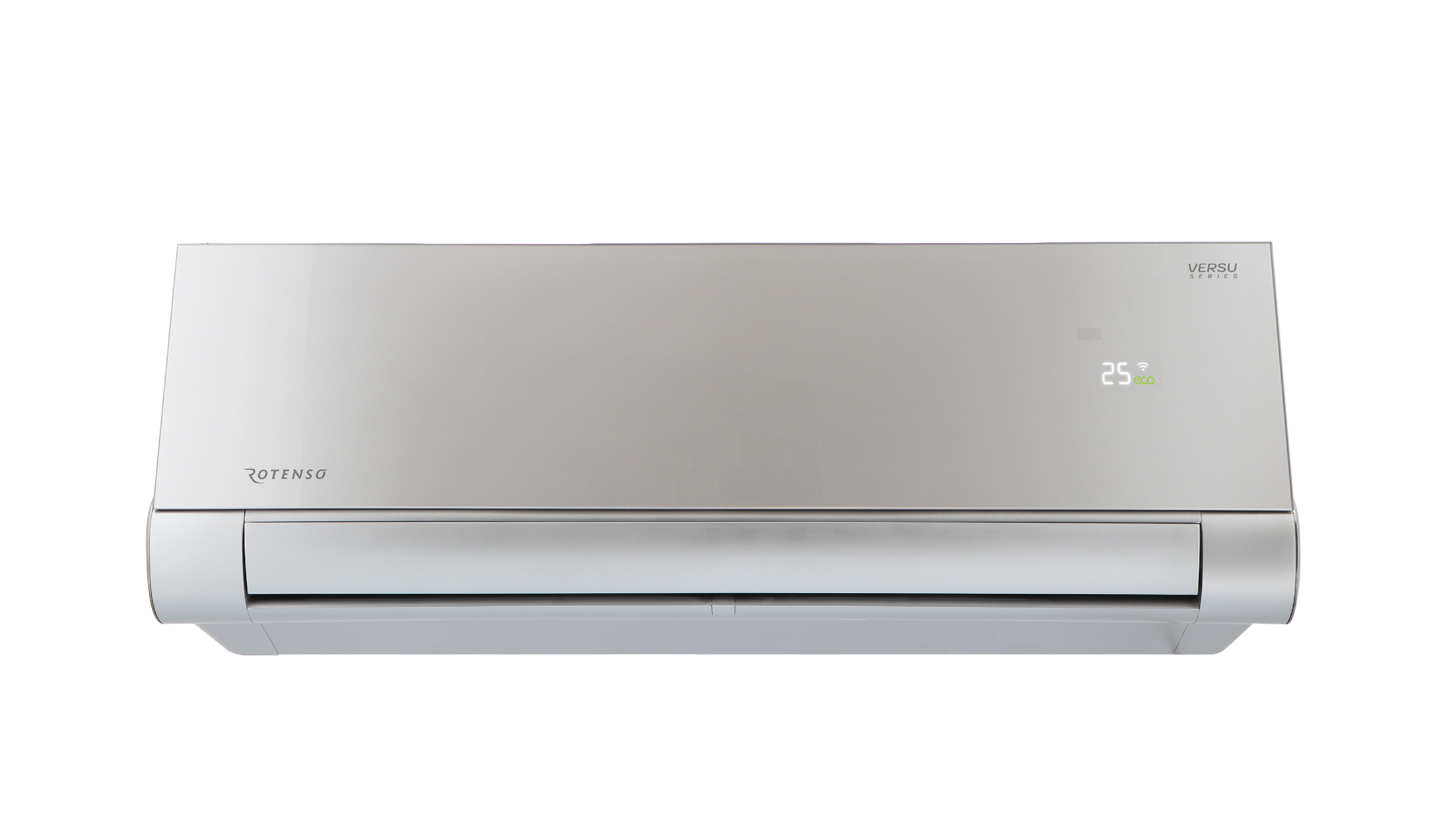 Klimatyzator Rotenso® Versu Silver jest dedykowany klientom ceniącym nowoczesny design. Srebrny panel frontowy podkreśla prestiż urządzenia i znakomicie komponuje się z każdym wnętrzem. Luksusowy charakter Versu dodatkowo uwydatnia subtelne podświetlenie – błękitne podczas trybu chłodzenia, pomarańczowe podczas grzania.