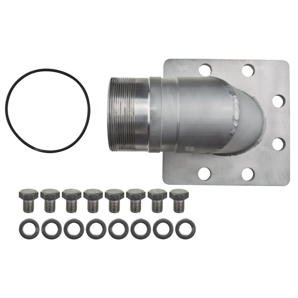 Kolano 90o do montażu do przyłącza tłocznego pompy do bezpośredniego podłączenia węża za pomocą przyłącza, z 1 zestawem osprzętu montażowego