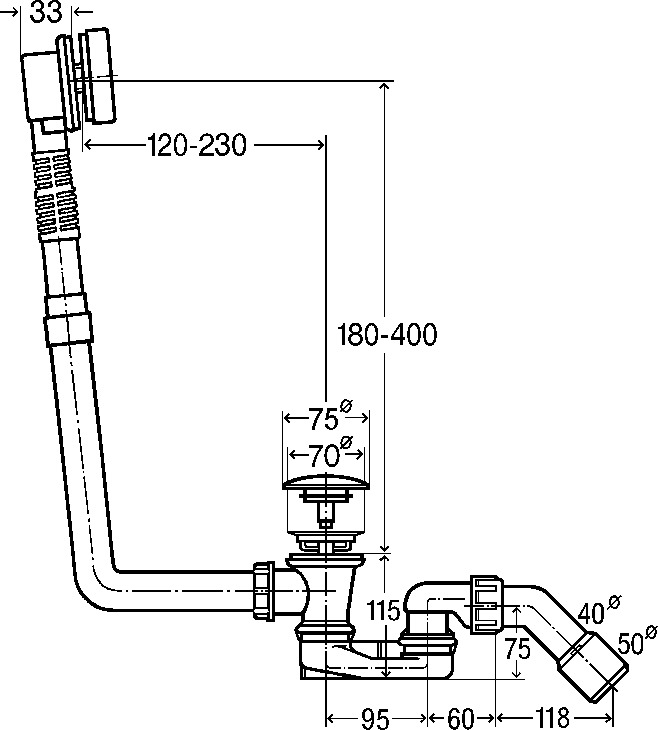 Komplet odpływowo-przelewowy. Wyposażenie: Technika zamykania na zatrzask, rozeta przelewowa, syfon, łuk odpływowy 45°. Wyposażenie: Technika zamykania na zatrzask, rozeta przelewowa, syfon, łuk odpływowy 45° bez możliwości klejenia. Dane techniczne: wysokość zamknięcia wodnego 50 mm, wydajność odpływu przy wysokości spiętrzenia 300 mm 0,92 l/s, wydajność przelewu wysokość spiętrzenia 60 mm nad środkiem otworu przelewowego 0,60 l/s, wg PN-EN 274, nr wzoru 6177.45, nr kat. 572 853,