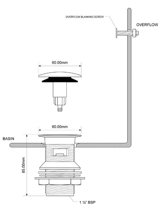 Spust umywalkowy z serii „GLASGOW” 1.1/4″x90x60mm wykonany z mosiądzu, z korkiem dekoracyjnym i mechanizmem otwierającym i zamykającym odpływ „klik-klak”, z otworem przelewowym. Inne dostępne kolory: CW60-CB – chrom, CW60-SC – satyna, CW60-AB – antyczny mosiądz.