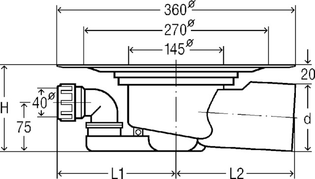 Advantix-korpus odpływu podłogowego, wymiar systemowy 145, nie występuje: nasadka. Wyposażenie: Korek, kołnierz uszczelniający, syfon wyjmowalny, dopływ DN40 obrotowy, wg PN-EN 1253, nr wzoru 4955.15, nr kat. 285 050, DN: 70 d: 75 L1: 165 L2: 130 H: 120 wydajność odpływu przy wysokości spiętrzenia 10 mm: 0.6 l/s, wydajność odpływu przy wysokości spiętrzenia 20 mm: 1.1 l/s, wydajność dopływu: 2.3 l/s, odpływ poziomy,