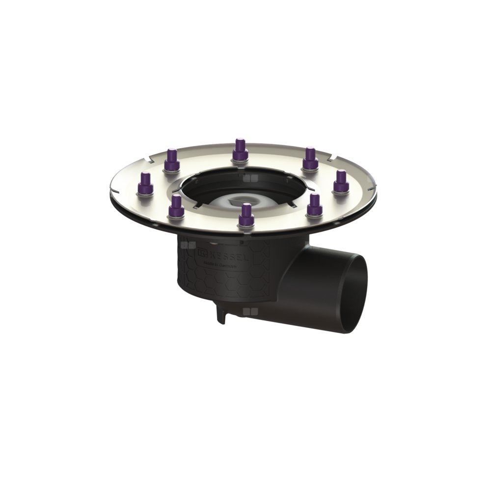 KESSEL Korpus Ecoguss, wielkość nominalna (DN) 80, króciec boczny, odwodnienie przez odpływ punktowy, syfonem w zestawie, zszczelnienie korpusie przez Dociskowy kołnierz uszczelniający (odpowiedni do tworzenia uszczelnień wodoszczelnych)