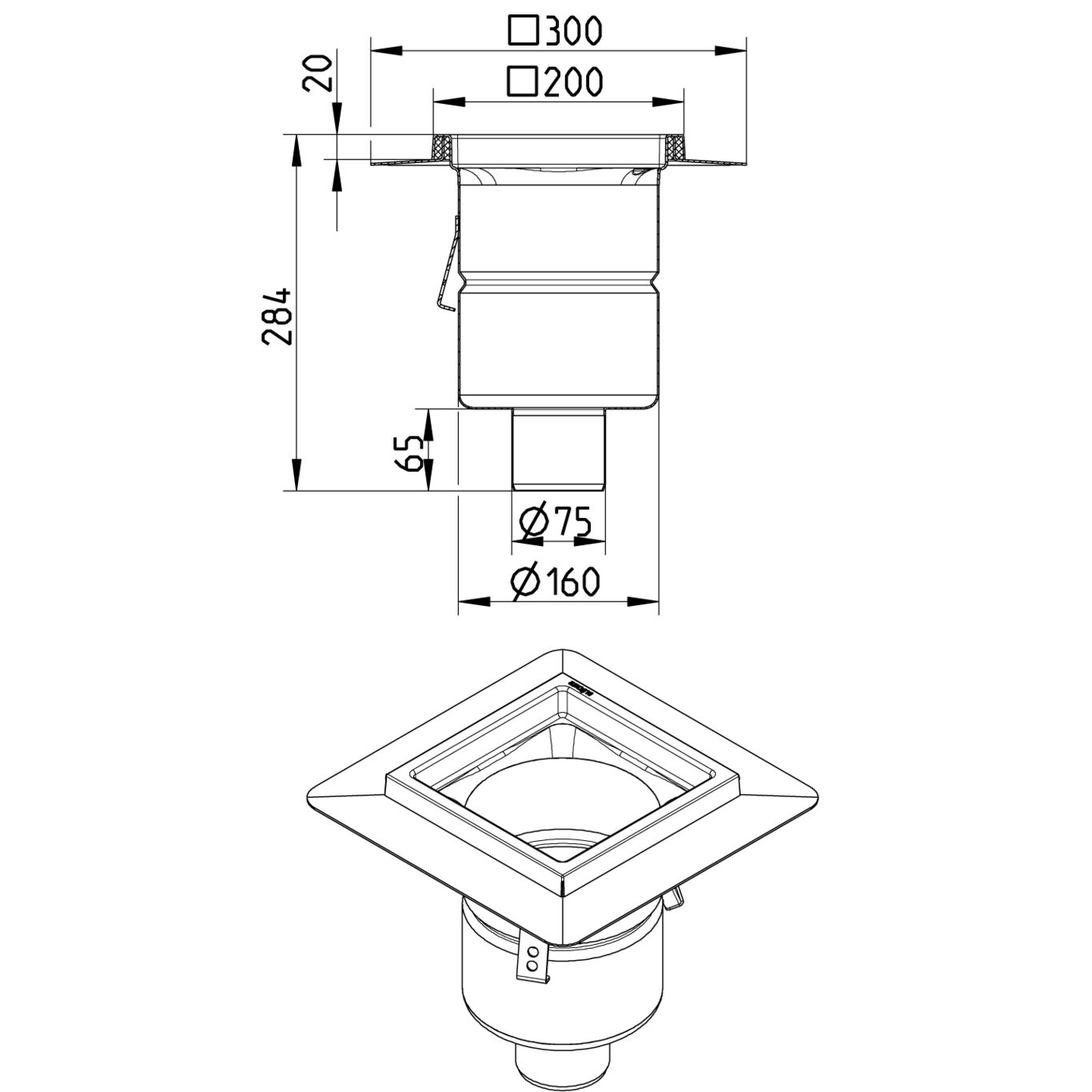 Korpus wpustu przemysłowego, jenoczęściowego, góra okrągła 200, odpływ pion DN =75-V, do podłóg z izolacją wylewaną
