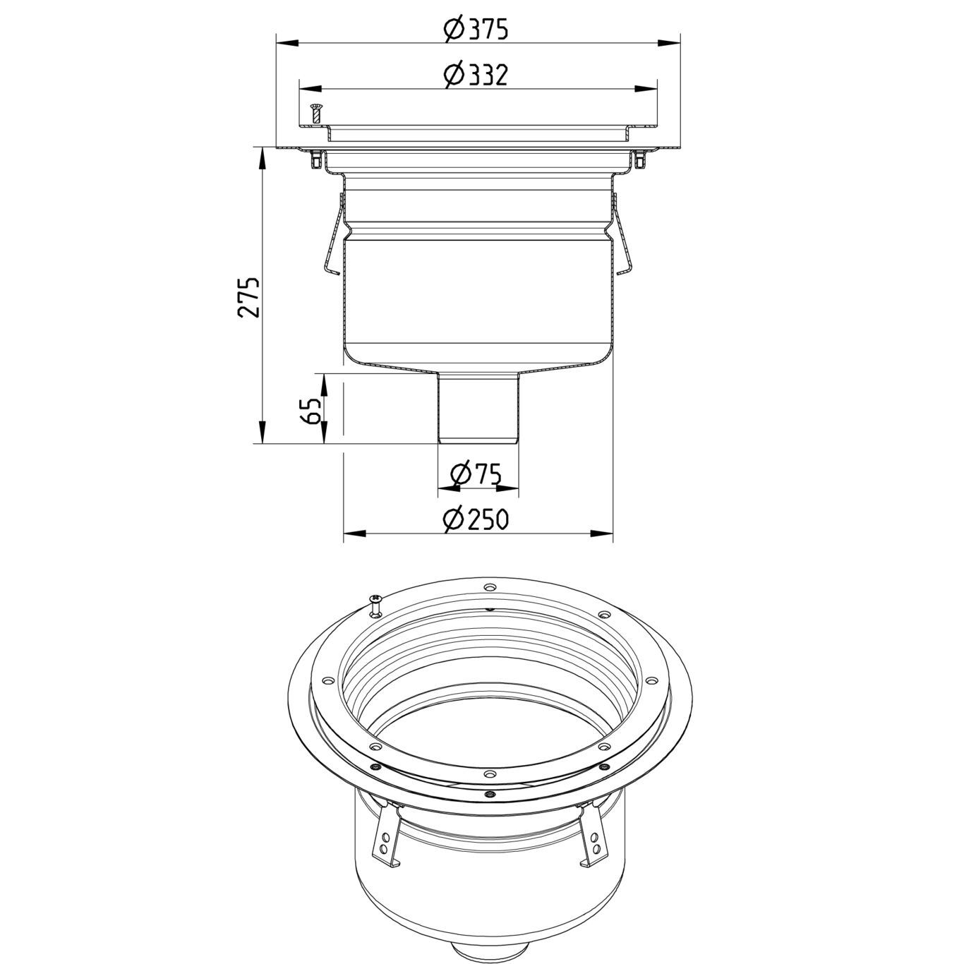 Korpus wpustu przemysłowego, jenoczęściowego, góra okrągła 300, odpływ pion DN =75-V, do podłóg z wykładziną winylową, niski model