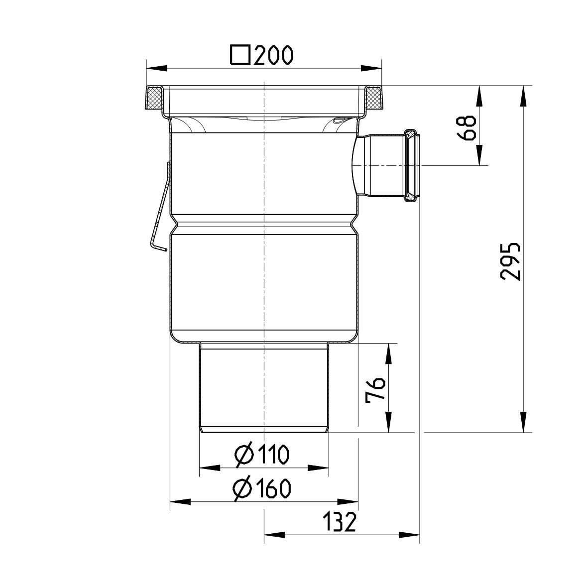 Korpus wpustu przemysłowego, jenoczęściowego, kwadrat 200, odpływ pion DN =110V, z bocznym dopływem DN =50, stal kwasoodporna