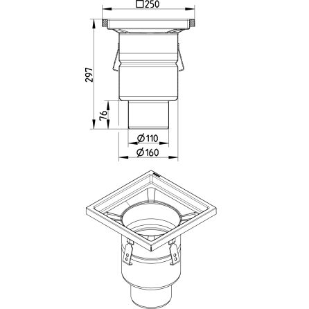 Korpus wpustu przemysłowego, jenoczęściowego, kwadrat 250, odpływ pion DN =110-V, stal kwasoodporna