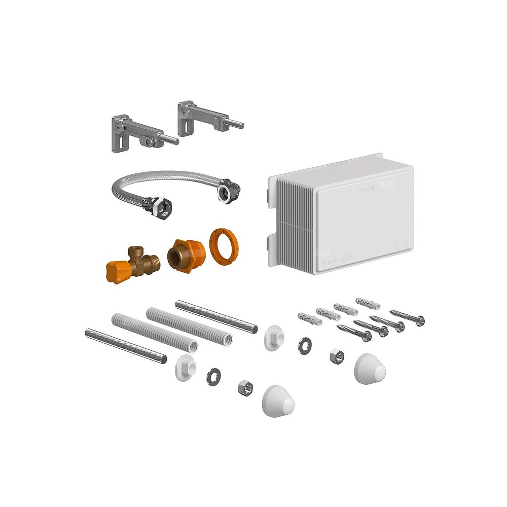 Komplet montażowy dla stelaży podtynkowych AQUA SYSTEM z serii 2/4. Zawartość opakowania: zaślepka szpilki ramy x 2 szt.; prowadnica szpilki ramy x 2 szt.; szpilki do mocowania muszli - pręt gwintowany M12x160 ocynkowany DIN 975 / DIN 976 x 2 szt.; osłonka plastikowa na szpilki 18mm x 2 szt.; podkładka ocynkowana ⌀13 x ⌀34 x 2,5 x 2 szt.; nakrętka sześciokątna M12 DIN 934 x 4 szt.; wkręt podkładkowy M8x70 x 4 szt.; kołki rozporowe 12x60 x 4 szt.; tunel serwisowy x 1 szt.; mufa zasilająca z tuleją mosiężną x 1 szt.; nakrętka mufy zasilającej x 1 szt.; wężyk w oplocie kątowy o długości 200 mm x 1 szt.; zawór odcinający mosiężny x 1 szt.; uchwyt ścienny długi QUICK FIX x 2 szt.