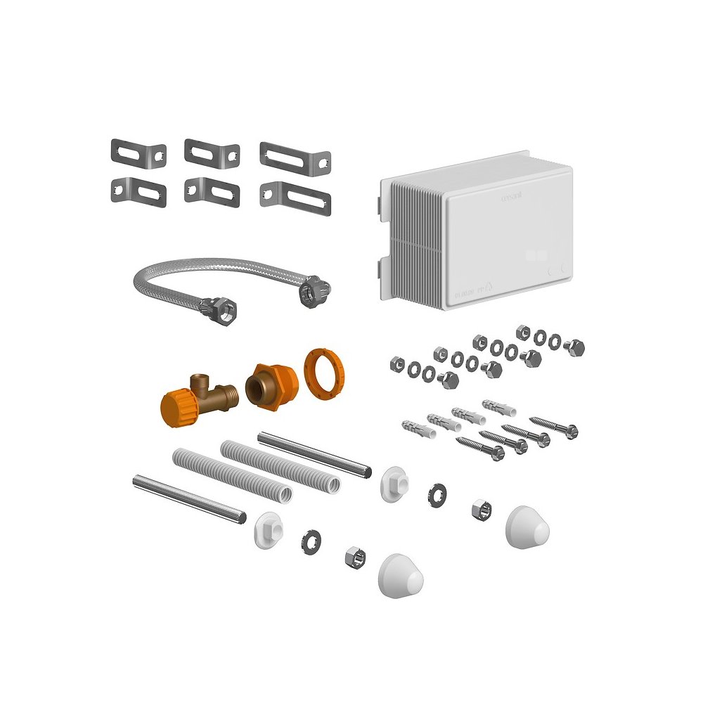 Komplet montażowy dla stelaży podtynkowych AQUA SYSTEM z serii 5/7. Zawartość opakowania: Uchwyt ścienny krótki x 4 szt.; uchwyt ścienny długi regulowany x 2 szt.; zaślepka szpilki ramy x 2 szt.; prowadnica szpilki ramy x 2 szt.; szpilki do mocowania muszli - pręt gwintowany M12x160 ocynkowany DIN 975/DIN 976 x 2 szt.; podkładka ocynkowana ⌀13 x ⌀34 x 2,5 x 2 szt.; nakrętka sześciokątna M12 DIN934 x 4 szt.; kołki rozporowe 12x60 x 4 szt.; nakrętka sześciokątna M10 DIN 934 x 2 szt.; podkładka M10 DIN 125 x 6 szt.; wkręt podkładkowy M8x70 x 4 szt.; śruba z łbem sześciokątnym ocynkowana M10x20 DIN 933 x 4 szt.; osłonka plastikowa na szpilki. peszel 18 mm x 2 szt.; tunel serwisowy x 1 szt.; mufa zasilająca z tuleją mosiężną x 1 szt.; nakrętka mufy zasilającej x 1 szt.; wężyk w oplocie kątowy o długości 300 mm x 1 szt.; zawór odcinający z wymienną głowicą x 1 szt.